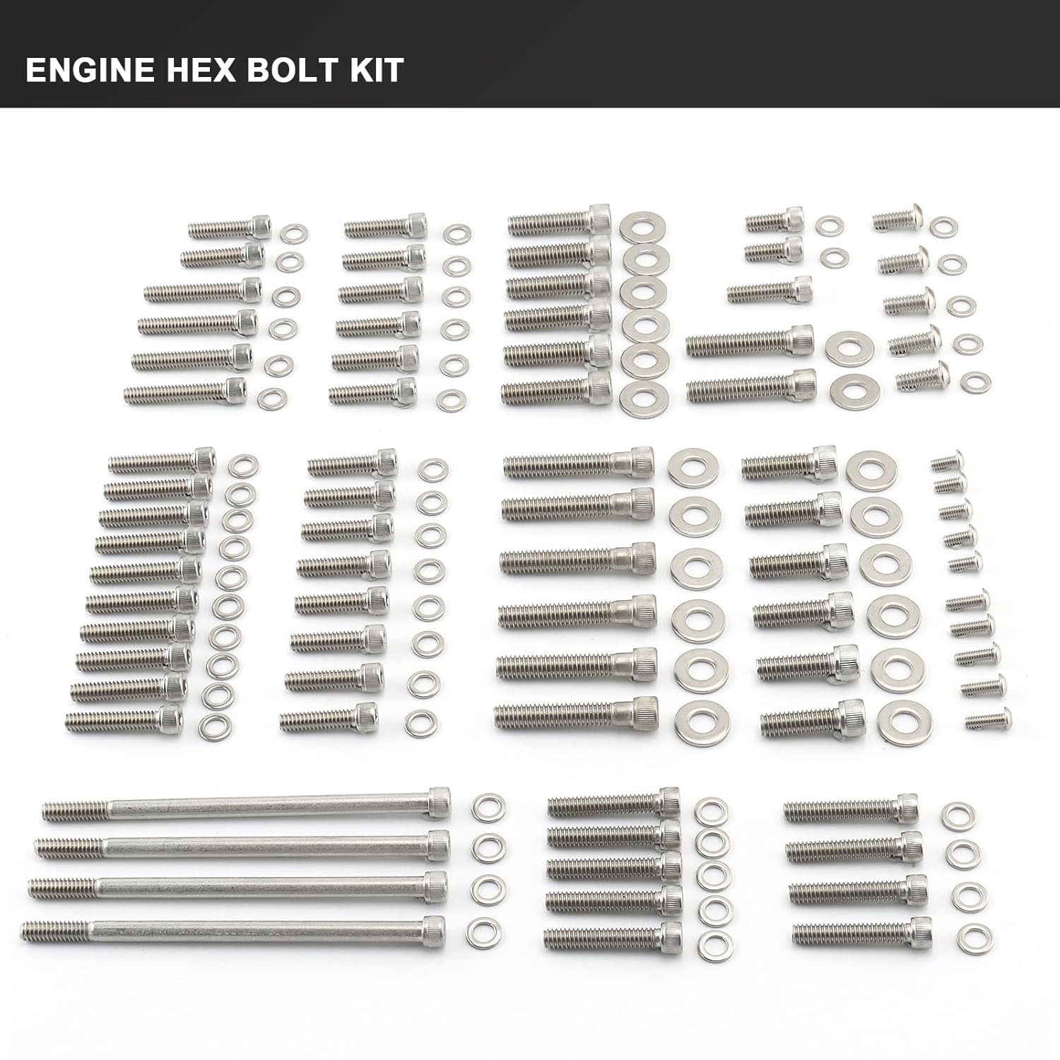 APPLICABLE: The bolt kit consists of Cam Cover, Timing Cover, Lifter Blocks, Rocker Boxes, Primary Cover, Trans Top, Trans Side Cover, Trans Side Door, and Derby Cover, Crank Position Sensor, Speed Sensor.FITMENT: Engine Bolt kit fit for Harley 2007-2016 Touring Electra Glide Street Glide Road Glide Road King CVO Models.Specification:Material: The entire set of bolts is made of stainless steel. Color: stainless steel color.Package: 1 set of engine head bolt kit. No installation instructions.NOTE: We leave the knurls on the heads and polish the bolts. The engine bolts have the look of the original bolts, but help dress up the engine